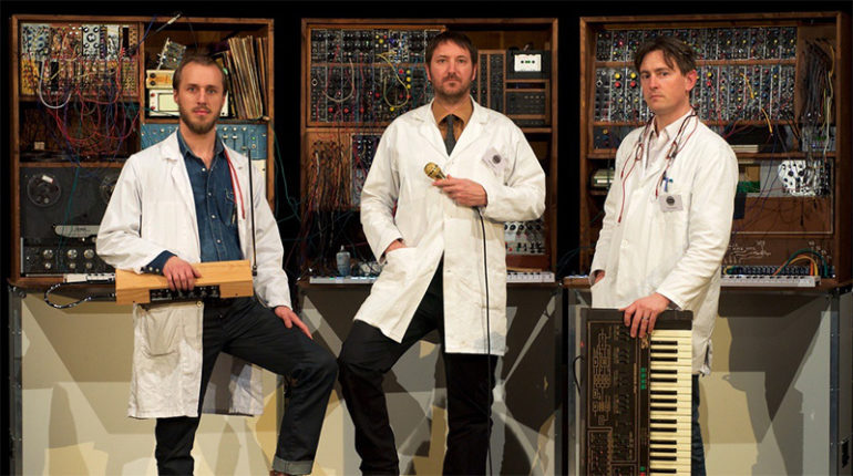Le GRAMI (Groupe de Recherche et d’Analyse de la Musique et des Instruments) se propose de remonter le temps, à l’époque de ce qu’on pourrait appeler les laboratoires d’analyse musicale, où les compositeurs, comme leurs assistants portaient des blouses sur leurs costumes, dans ces années où la recherche et la composition sonore, la musique et la science partageaient les mêmes locaux. Les trois scientifiques donnent accès à leur laboratoire pour une journée porte ouverte. Au cours de cette conférence, ils vont partager le fruit de leurs recherches. Entourés de machines et d’instruments de mesure (synthétiseurs modulaires, séquenceurs, boîtes à rythmes, theremin, enregistreurs à bande, oscilloscopes…), ils vont aborder et mettre en musique différentes techniques de synthèse sonore et de composition musicale électroacoustique. Progressivement la musique s’installe, la conférence cède la place à un concert associant la musique concrète à l’électro-pop minimaliste, résumant à lui seul l‘histoire probable de la musique électronique.