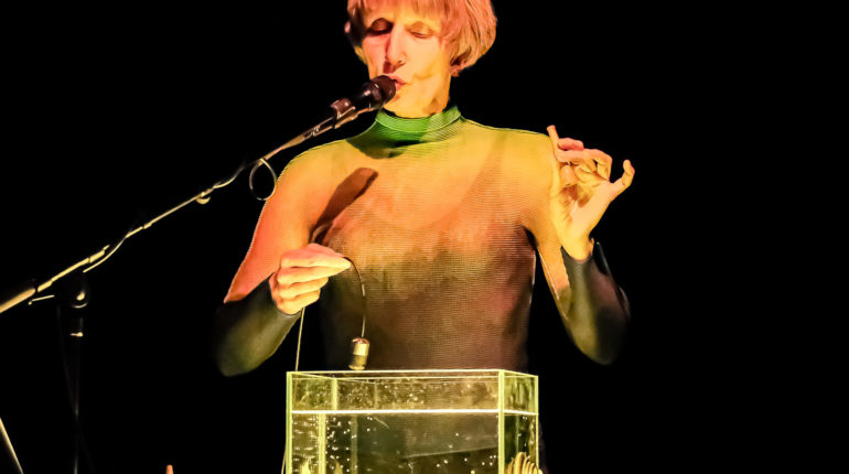 Ute Wassermann parcourt le monde en tant qu’improvisatrice, réalise des performances/installations audiovisuelles vocales et des compositions pour solistes et ensembles. Au cœur de ses recherches se trouve une exploration continue et sans compromis de sa voix. Le chant hors du commun d’Ute Wassermann transcende la voix humaine. Elle chante des sons sculpturaux multidimensionnels oscillant entre des qualités électroniques, animales, inorganiques et humaines. Ses méthodes pour étendre et aliéner la voix comprennent l’utilisation de sifflets à oiseaux, d’appareils électroniques lo-fi, de résonateurs, d’enregistrements sur le terrain et de différents types de microphones. Ses performances font appel à des objets du quotidien ou à des instruments inventés par elle-même pour la voix, qui peuvent prendre la forme de costumes acoustiques.